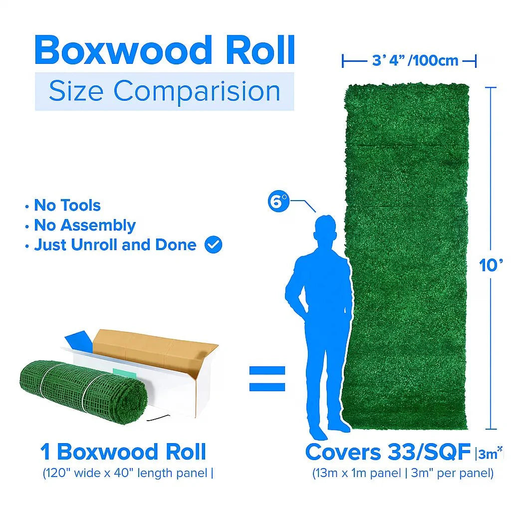 Designer Plants' Boxwood Green Wall Roll provides 33 sq ft of commercial-grade UV-resistant boxwood coverage in a flexible 10ft × 3.3ft roll format — ideal for long fence lines, continuous perimeter screening, and applications where standard 40×40in panels would require complex joining. Constructed from LDPE with integrated RealTex™ and UVTex™ UV inhibitors.