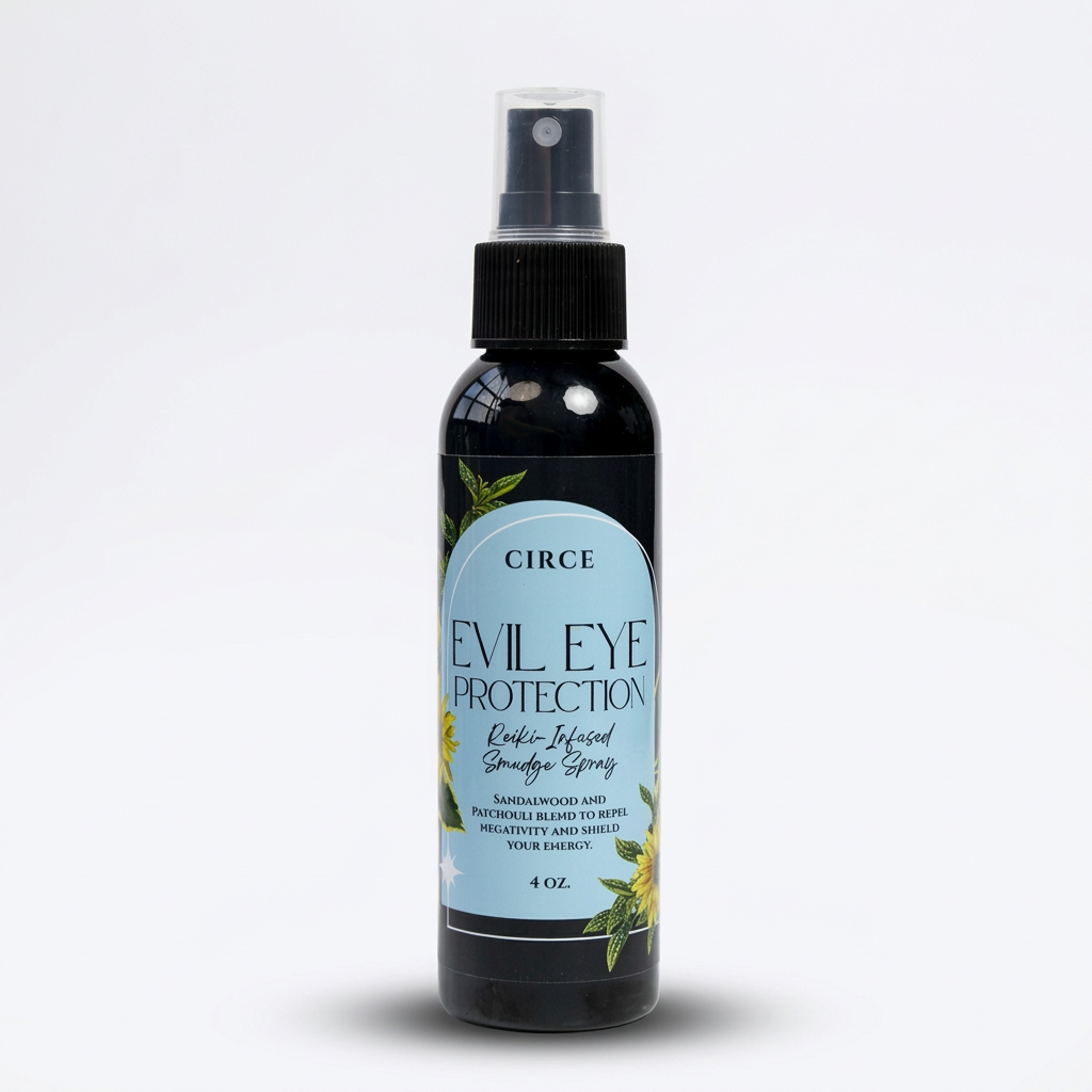 Introducing our Evil Eye Protection Ritual Spray, a 4 oz bottle of natural bliss scented with Sandalwood & Patchouli. Immerse yourself in the serene essence, perfect for spiritual cleansing of both space and self.