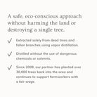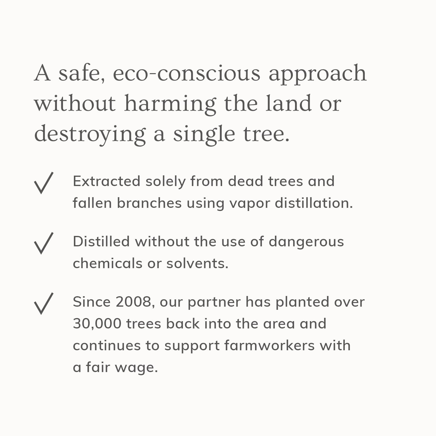 The palo santo (Latin name, Bursera Graveolens) in this formulation is wildcrafted in Ecuador and sustainably harvested solely from fallen trees and branches. We source specifically from a non-endangered species, not to be confused with Bulnesia Sarmientoi. Palo santo essential oil is extracted using vapor distillation, without the use of dangerous chemicals or solvents. This ensures a safe, eco-conscious approach without harming the land or destroying a single tree. We partner with a distributor who keeps a close relationship and connection to the family and with the local communities in Ecuador. They are committed to reforestation and giving back to the planet. Since 2008, our partner has planted over 30,000 trees back into the area and continues to support farmworkers with a fair wage. Their partnership has become a relationship that provides a lasting livelihood for the coastal communities who gather and steward this “Holy Wood” from South America.