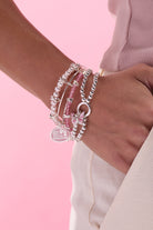 Show love, support, strength and solidarity with this Breast Cancer Awareness Butterfly stretch bracelet. This bracelet features two rows of shiny silver beads, ending at a shiny silver ring that has two charms. One is a clear crystal accent charm, and the other is a dimensional pink enamel butterfly charm that has the Breast Cancer Awareness ribbon on the front and has “hope strength and love” etched on the back.