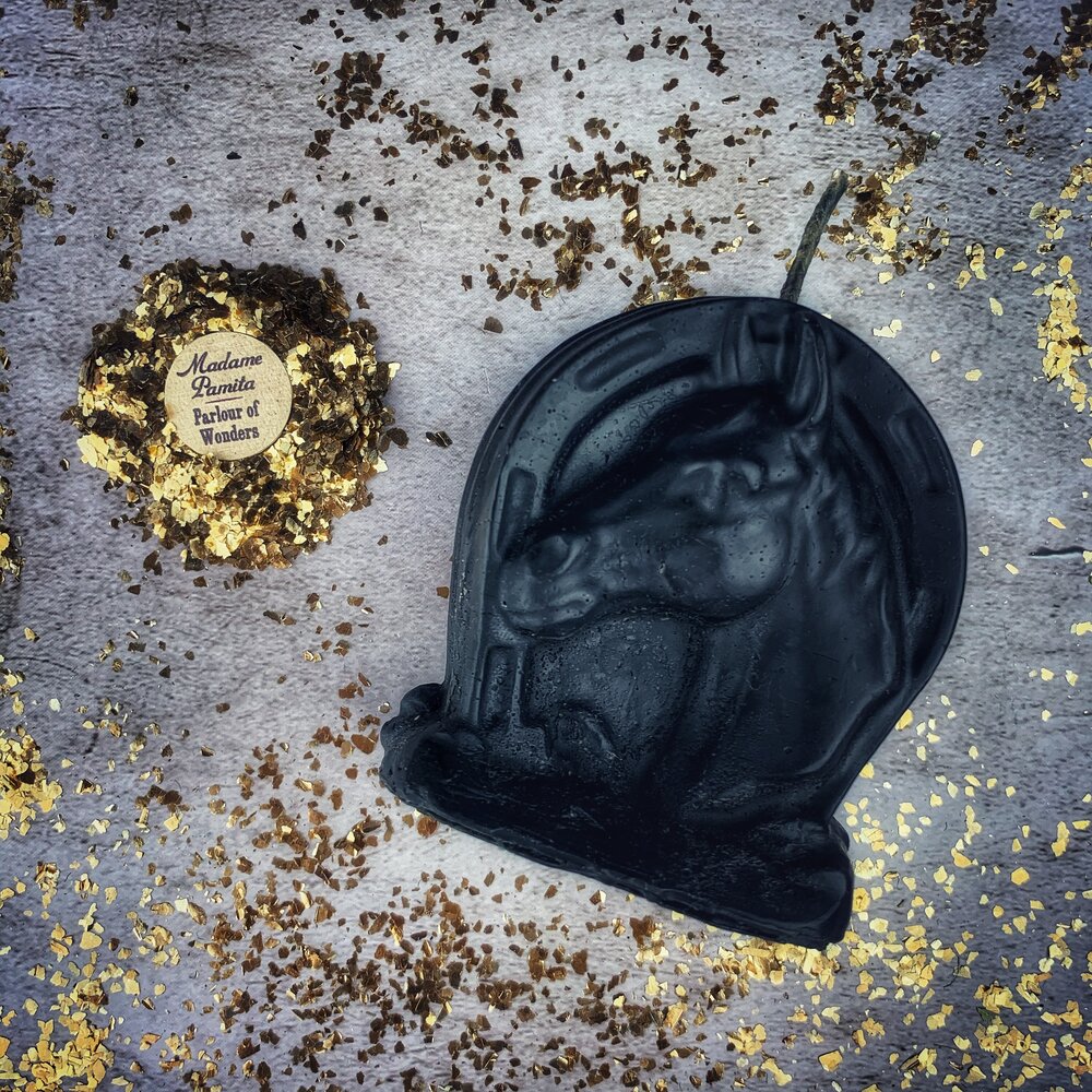 Invoke the legendary magic of the horseshoe and horse with this powerful beeswax spell candle. Whether you're seeking luck in games of chance, power in competitive situations, or attracting love, money, and opportunity, this candle combines two ancient emblems - the lucky horseshoe and the powerful horse - to bring winning energy and confident success into your life.