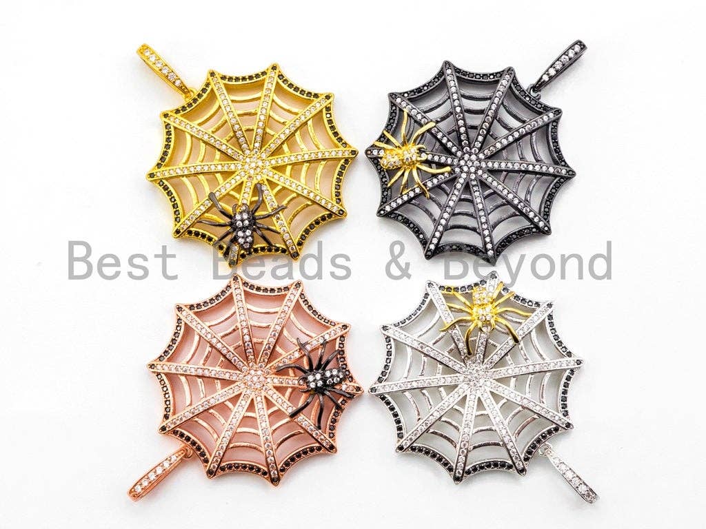 CZ Micro Pave Spide Web Pendant, CZ Spider Halloween Charm, Silver/Gold/Rose Gold/Gunmetal Color, 37x46mm, 1pc,SKU#F299