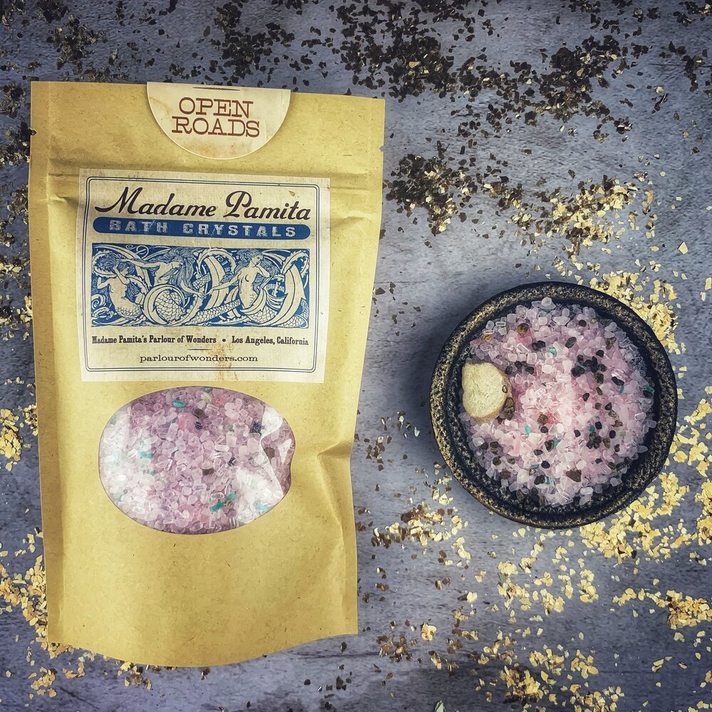The proprietary blend of ingredients in Open Roads Bath Crystals includes Peony root for success, Lemongrass essential oil to clear stuck energy and other herbs and oils to bring in opportunity and success.