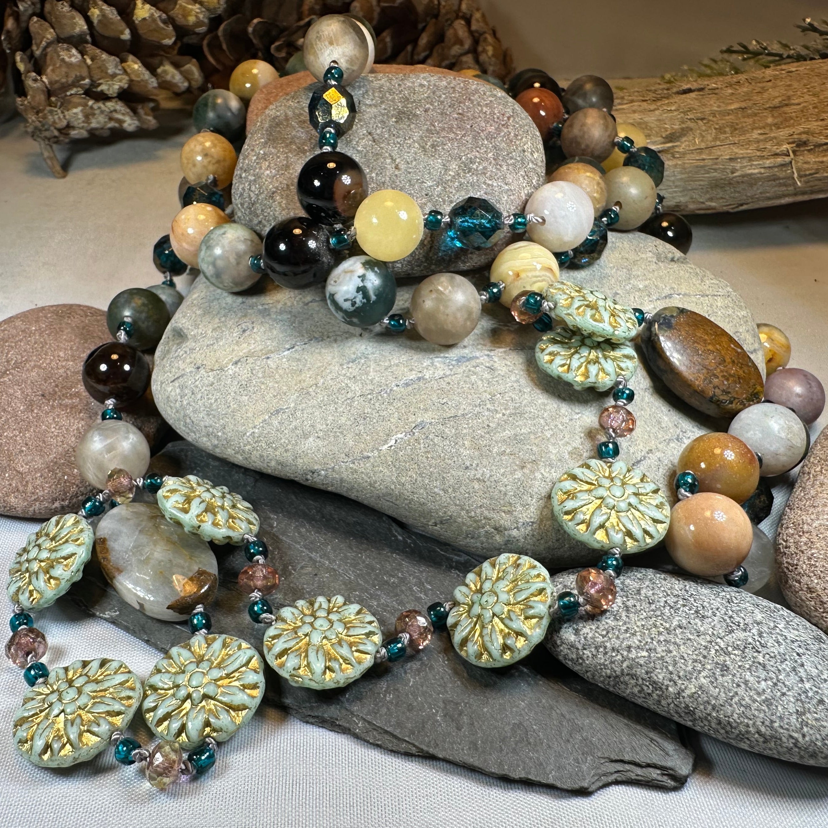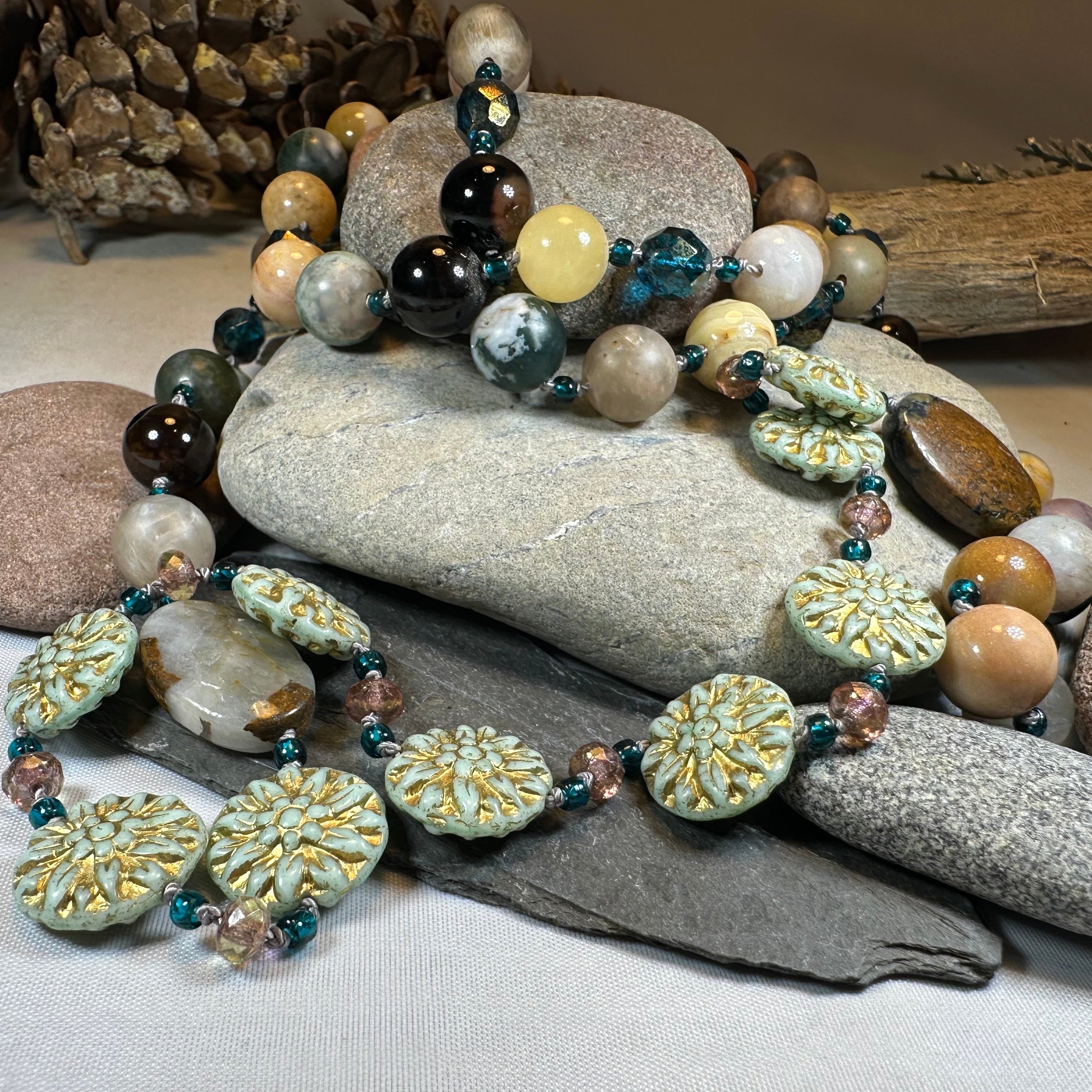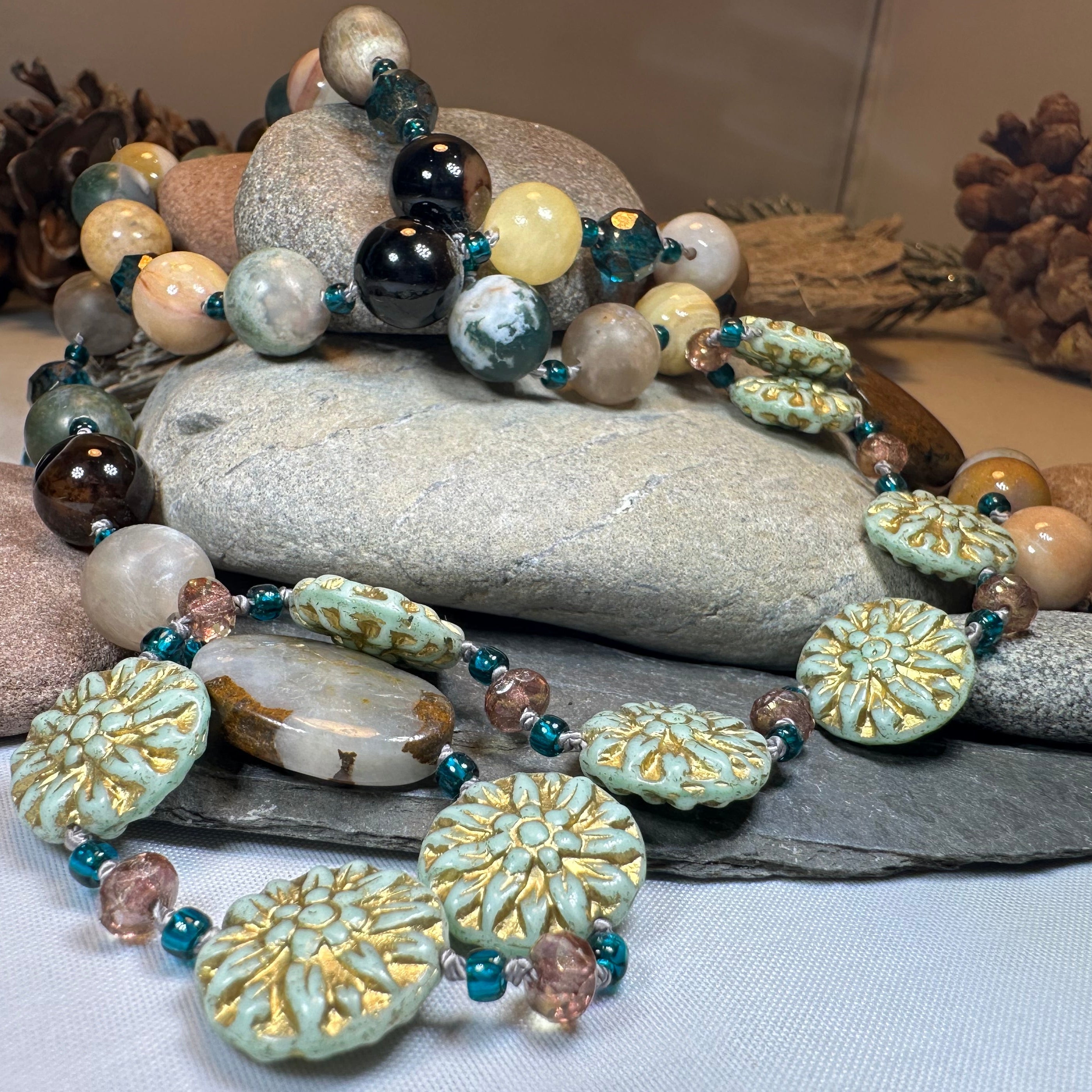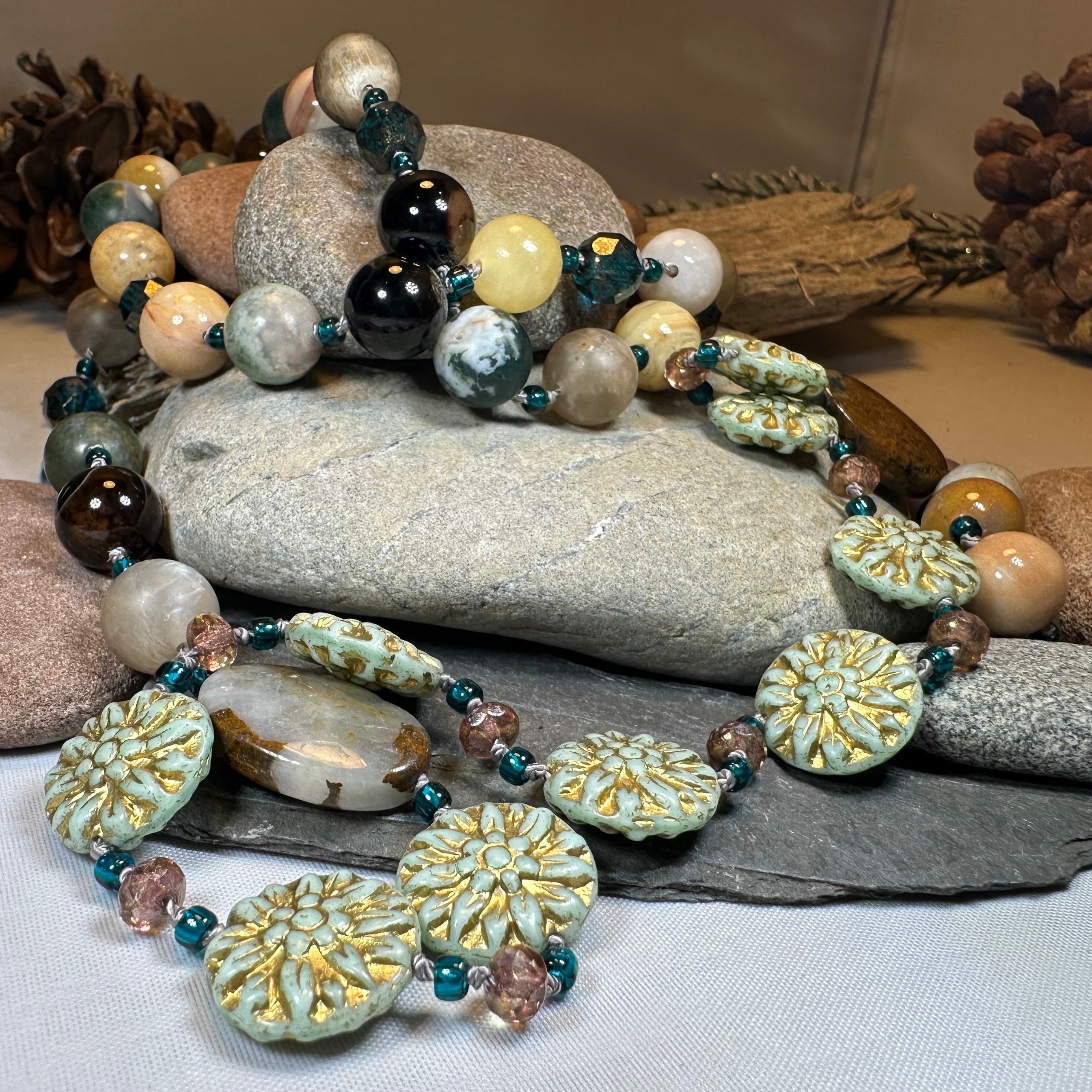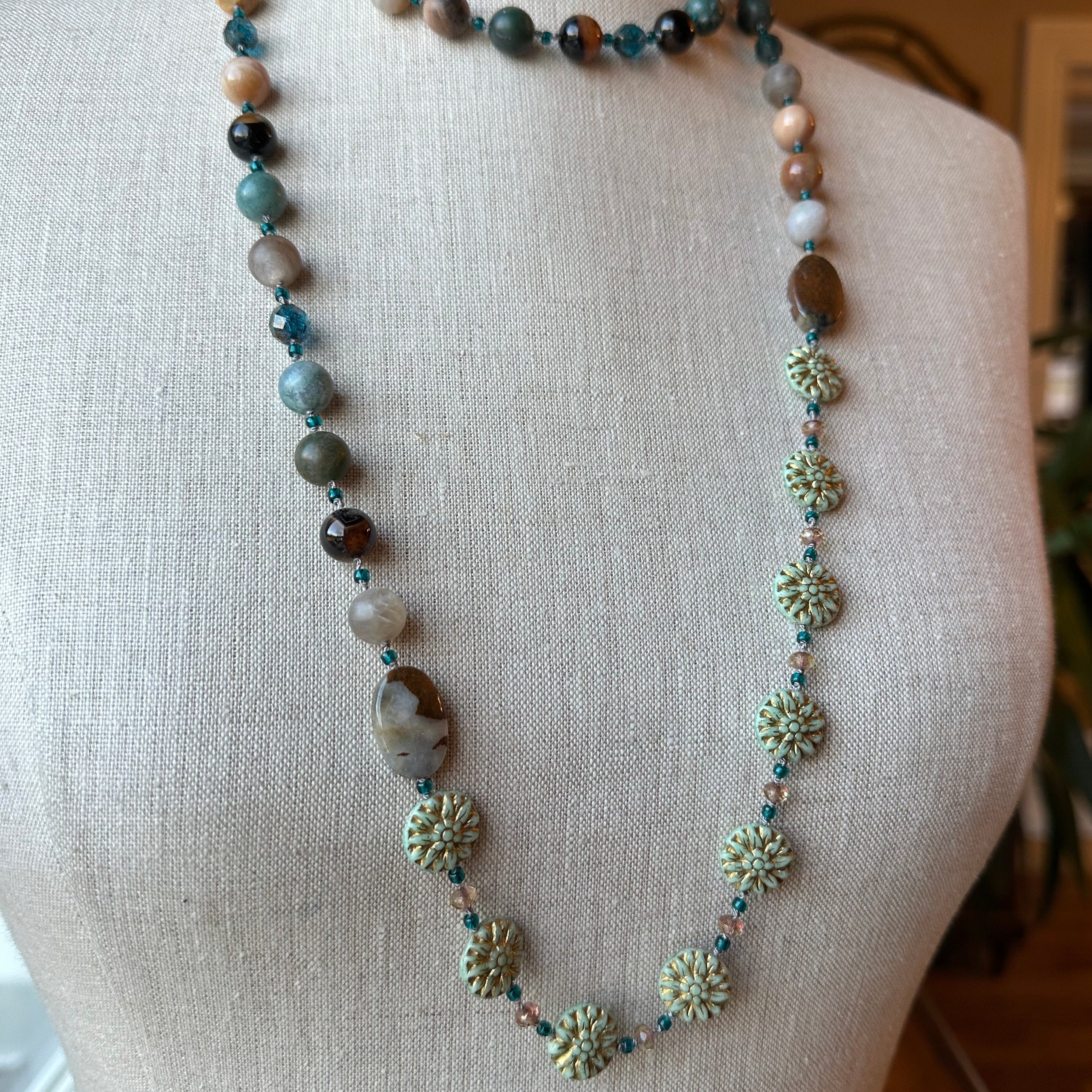 Beautiful dramatic and warm autumn colors: tan, teal, green, plum and brown with touches of gold. Gorgeous authentic agate beads, Czech pressed glass pale blue lotus beads, crystal seed beads, golden beads and cut crystal give this necklace a fun and flirty look!