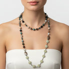 Hand knotted on silk cord. Necklace drop is 24" long (comes to just above the waistline when worn)
