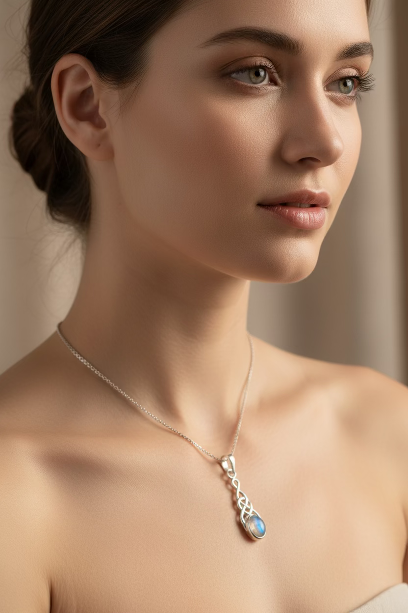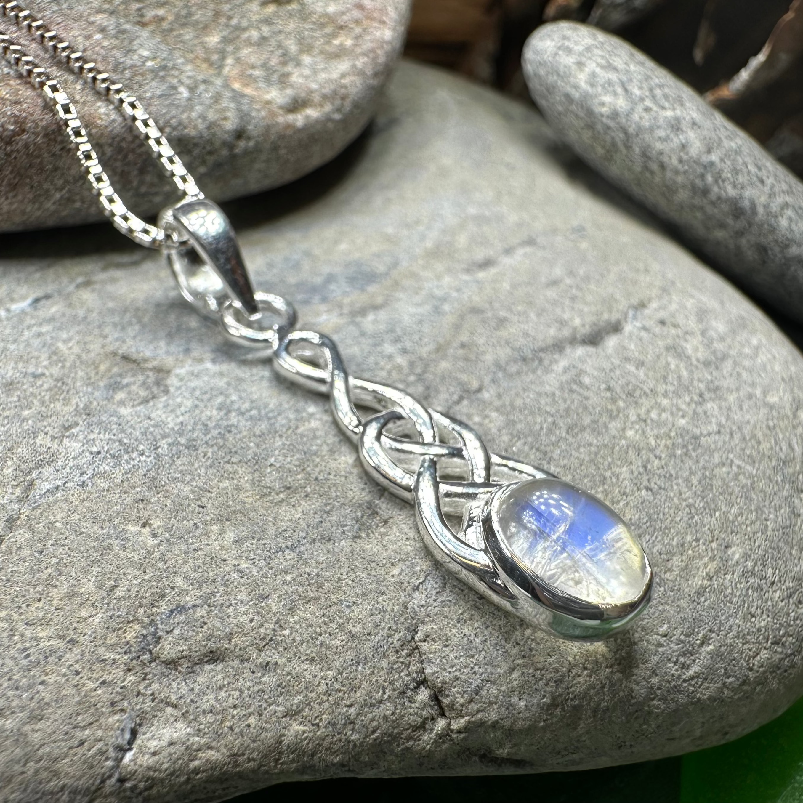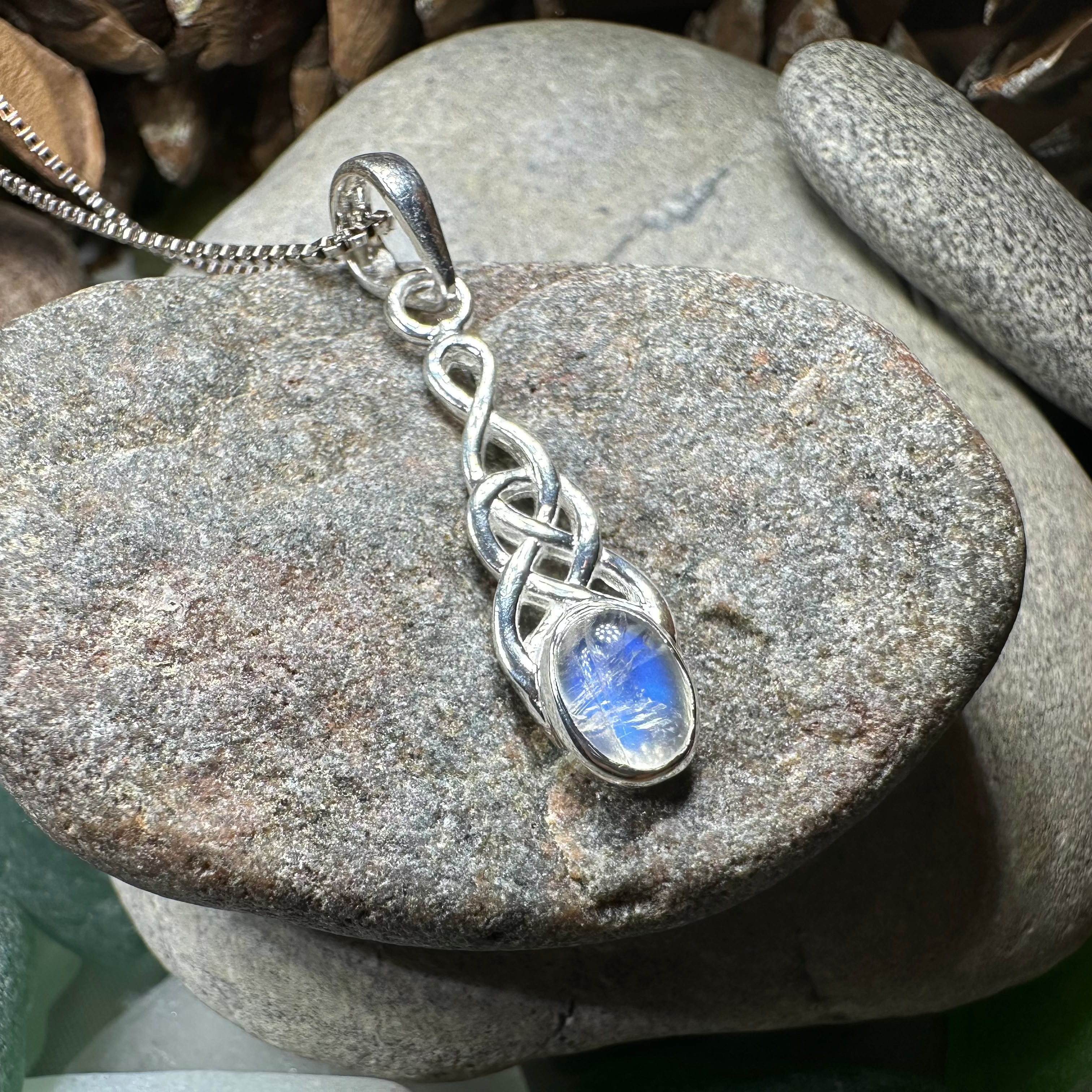 This Solid Sterling Silver Moonstone pendant is adorned with a vibrant 1 carat rainbow moonstone center with solid sterling silver Celtic knot work design - an artful rendition of the traditional Celtic knot.