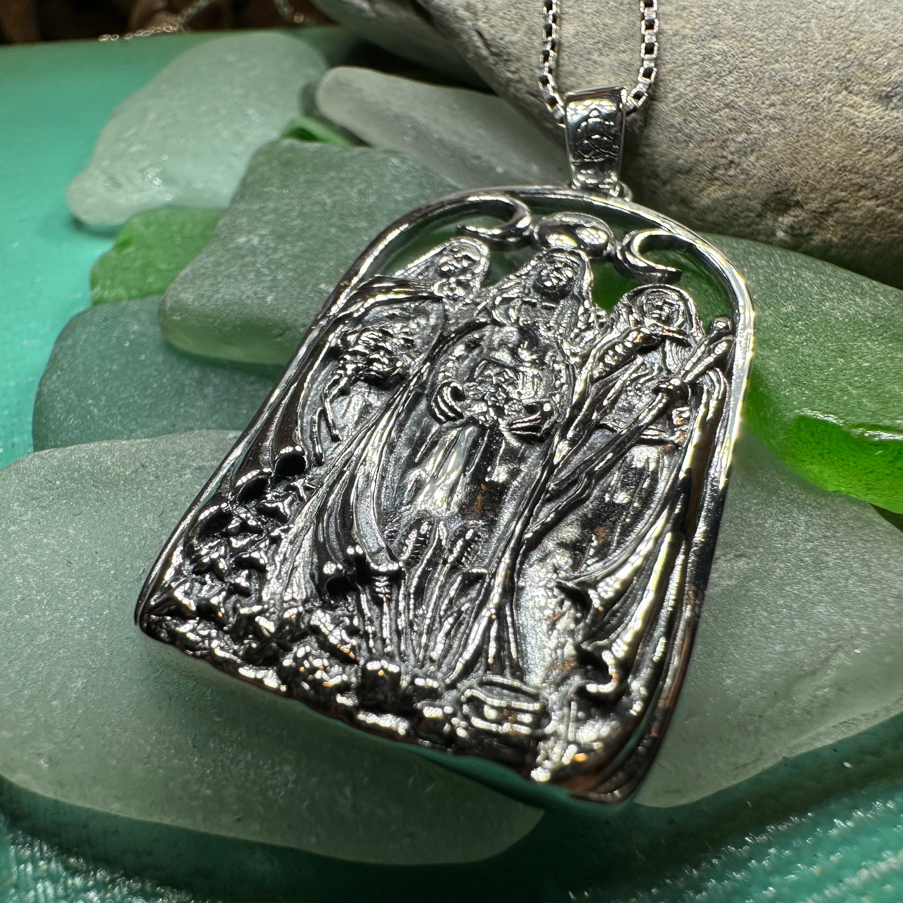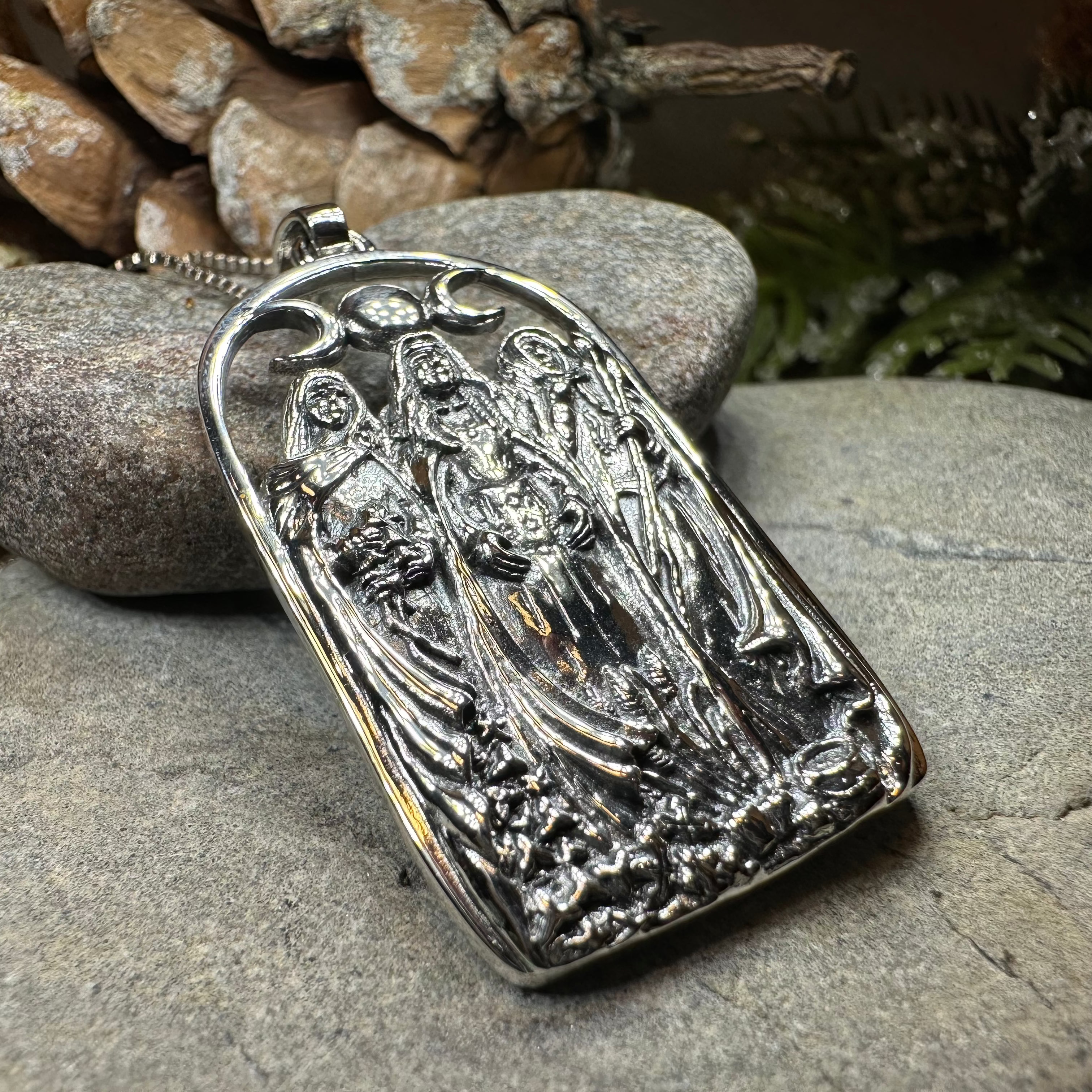 Solid Sterling Silver Hecate Maiden Mother Crone Pendant with sterling silver chain.