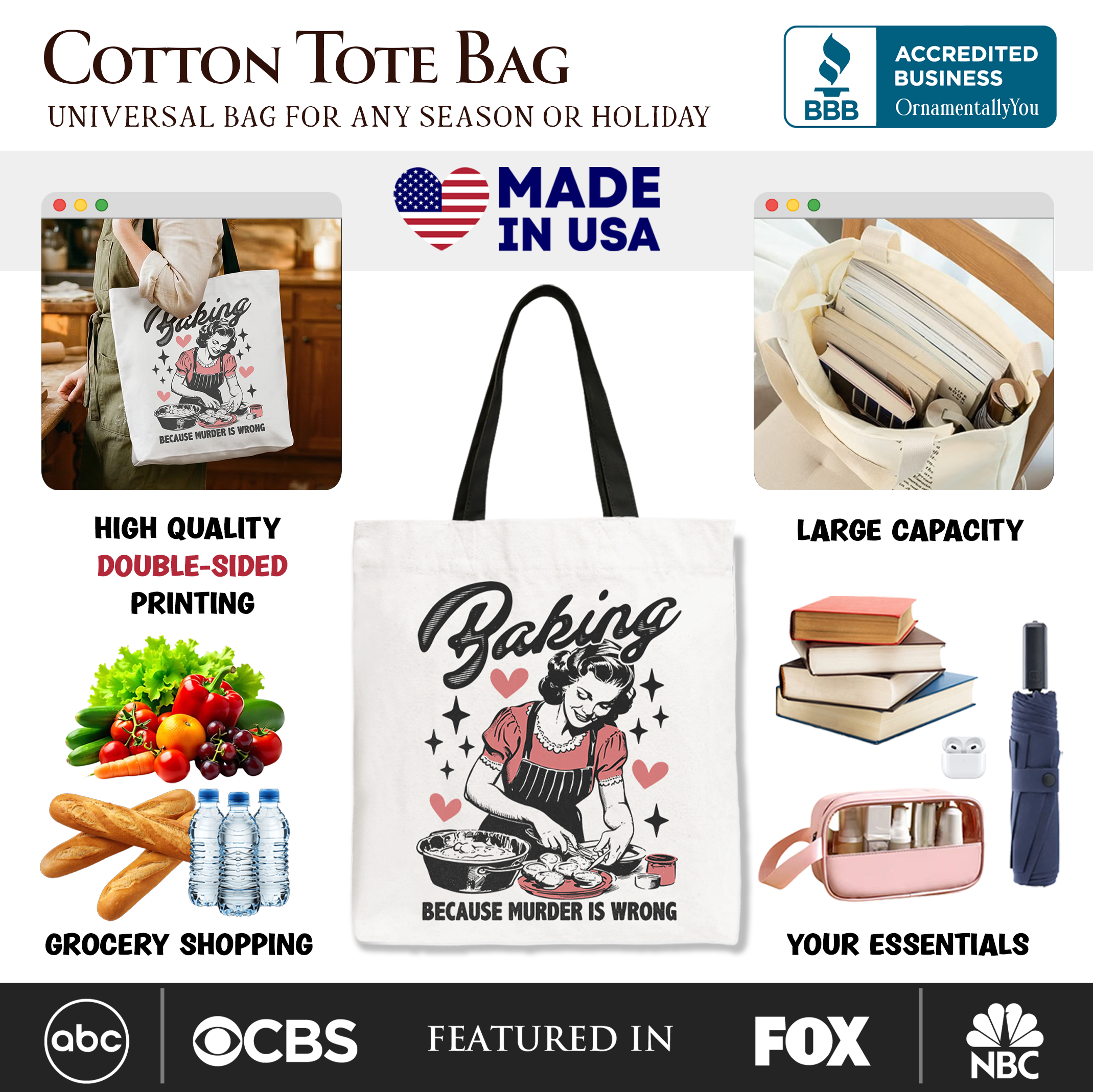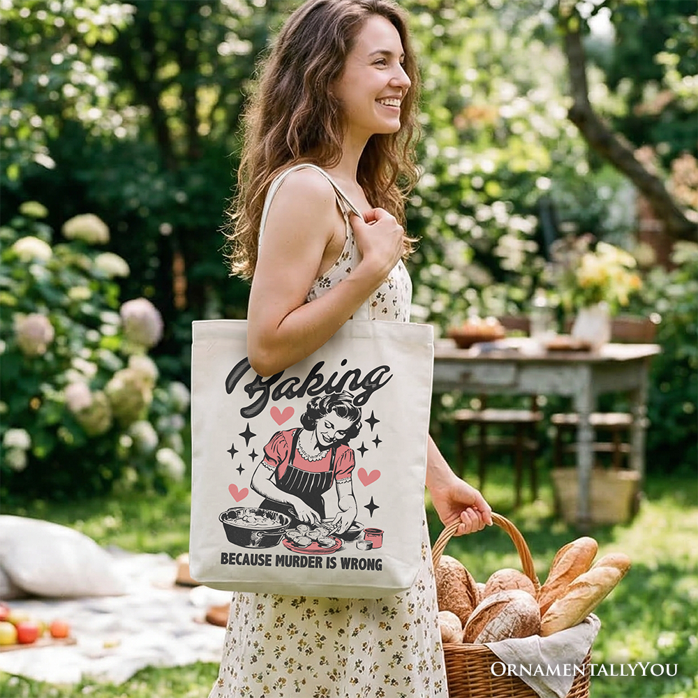 Baking Because Murder Is Wrong Anti-Valentine Tote Bag, Funny Retro Kitchen Gift Shopper