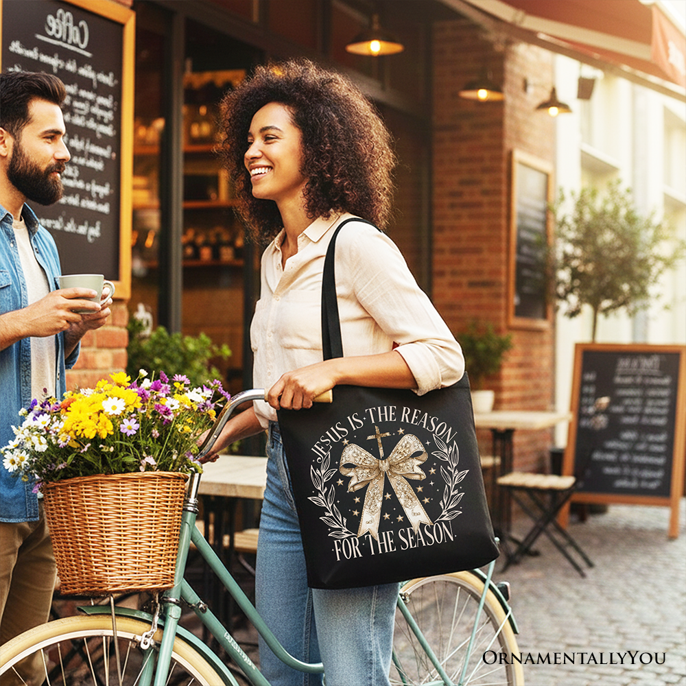 Jesus Is the Reason Christmas Tote Bag, Coquette Gold Bow Cross Gift Shopper for Faithful Women