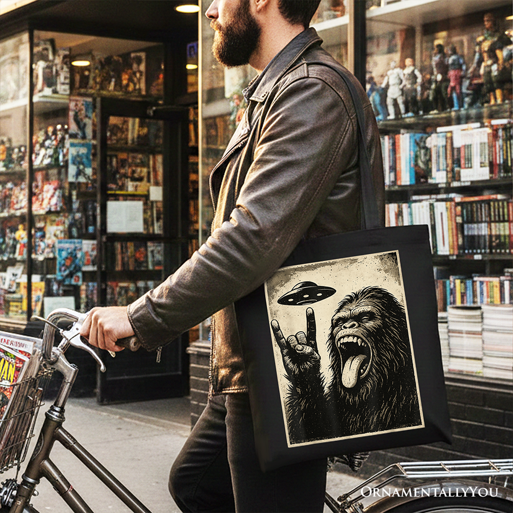 Bigfoot UFO Funny Canvas Tote Bag, Rock and Roll Sasquatch Meme Gift Shopper