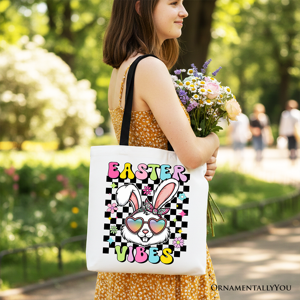 Retro Easter Bunny Sunglasses Tote Bag, Groovy Checkered Gift Shopper