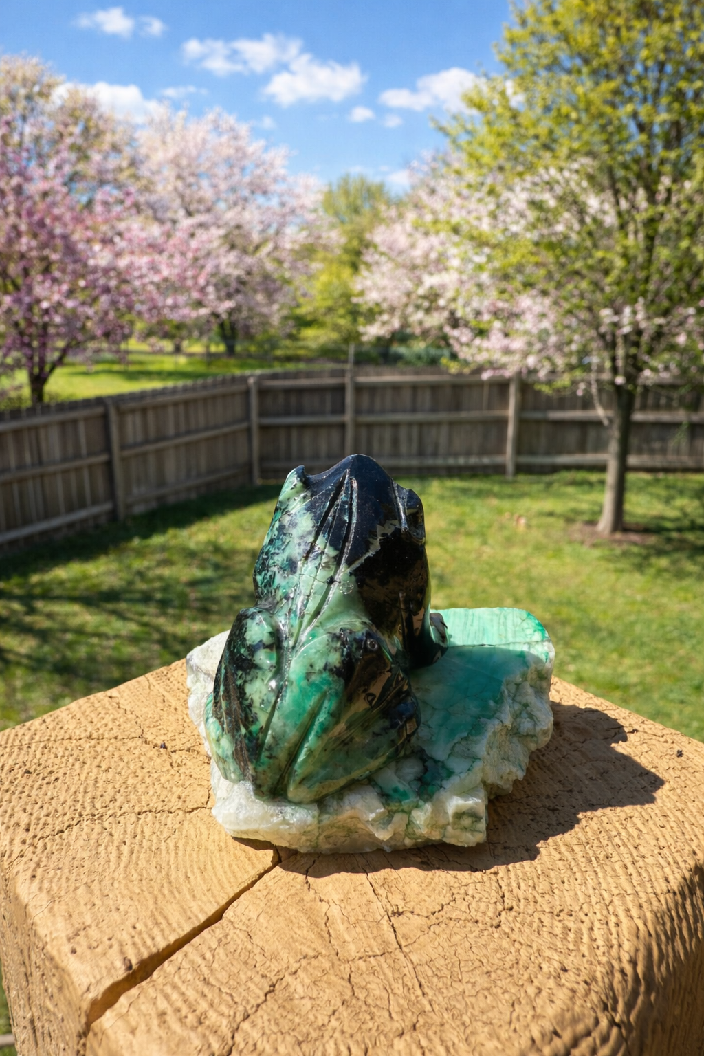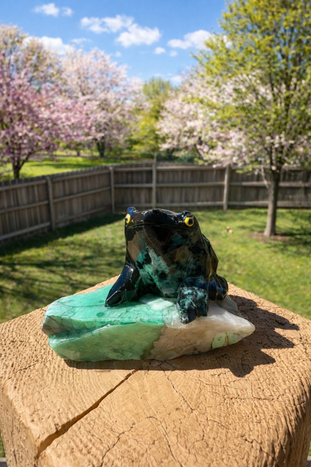 No two of these are the same and we have handpicked beautiful pieces for you from the Gem Show! Choose the one you want. This frog is approximately 3 inches in height and 4 inches at the widest point.