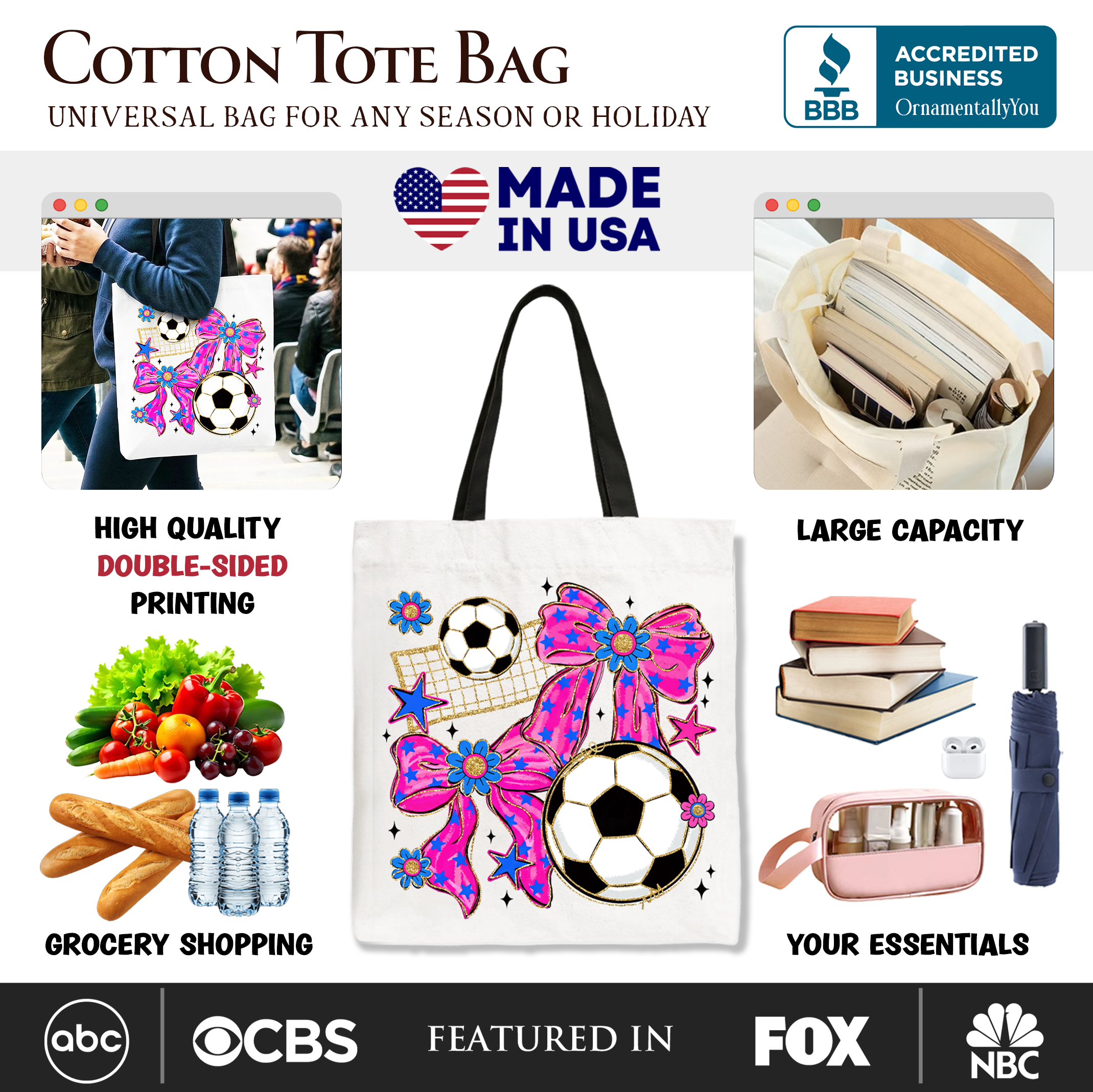 Show off your sporty style with this adorable soccer coquette pink bow tote bag, the perfect soccer fan tote, game day bag, and preppy aesthetic shopper for players and fans alike. Designed with a charming pink bow and soccer-inspired style, this cute soccer tote bag blends feminine coquette fashion with athletic spirit, making it ideal for carrying daily essentials, practice gear, books, groceries, or stadium must-haves on match day. Whether you're heading to a soccer game, school, the gym, or a weekend outing, this stylish soccer fan tote adds a playful and trendy touch to any outfit. A fun and thoughtful soccer lover gift, this reusable tote is great for teens, athletes, and anyone who loves the coquette aesthetic and sporty fashion. ⚽🎀👜