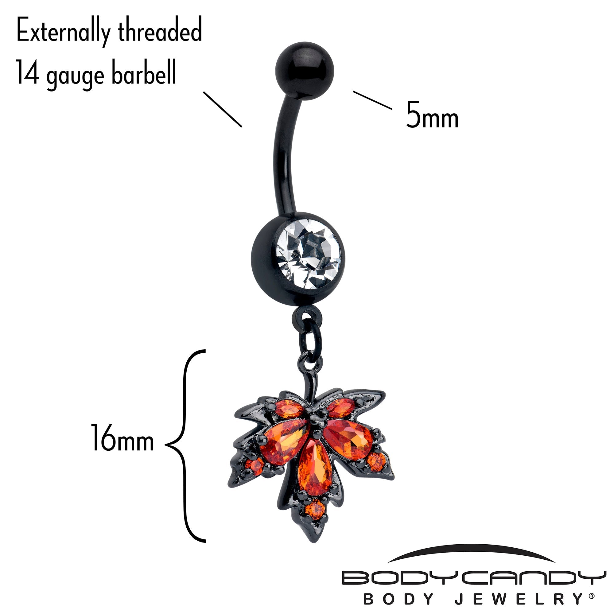 Get ready to fall in love with fall with this 14 gauge navel ring. It is made with a 3/8 inch black PVD over 316L surgical grade stainless steel curved barbell with a 5mm top ball end. The bottom ball end is 8mm and set with a large, clear gem. Dangling beneath it is a maple leaf charm, set with orange cubic zirconia gems. It further features understated detailing for elegantly simple style. You will be all dolled up for autumn with this classic and colorful belly piercing jewelry.Specifications