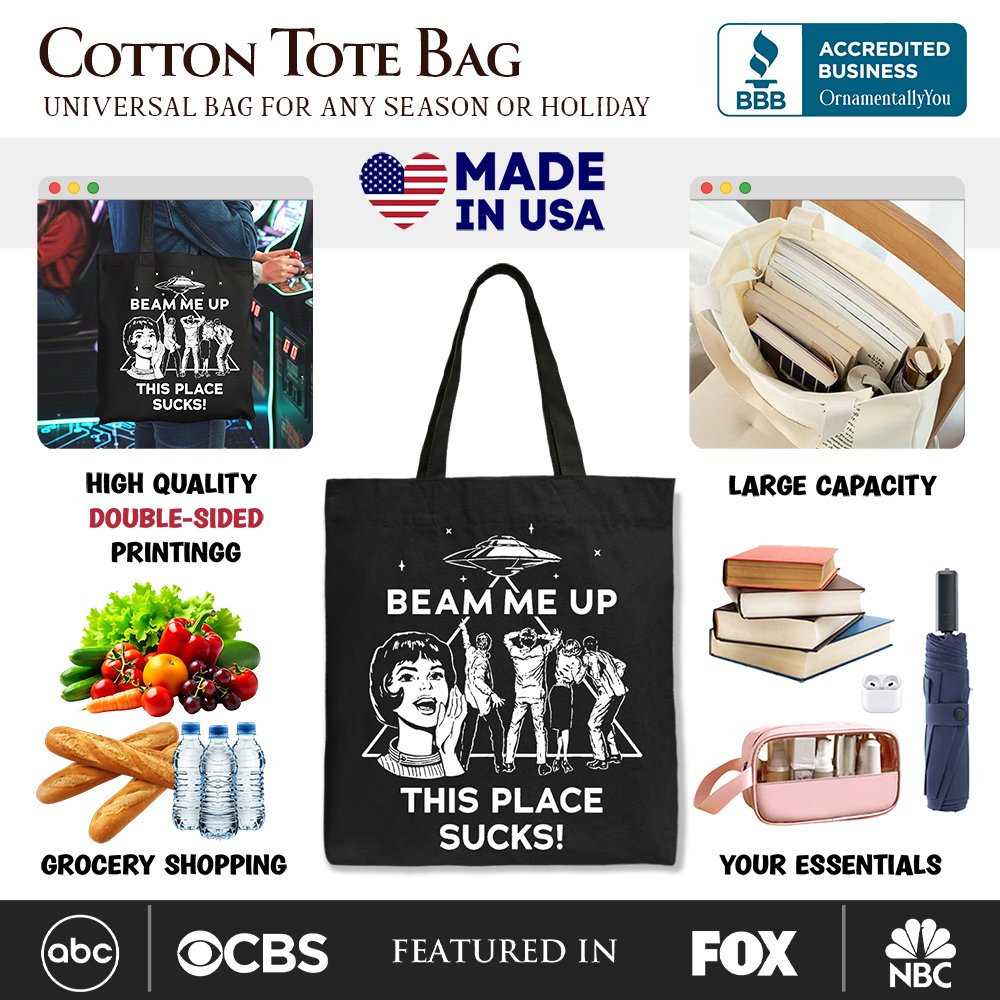 Beam Me Up This Place Sucks Comic Sarcastic Canvas Tote Bag, Woman Retro UFO Meme Funny Gift Shopper