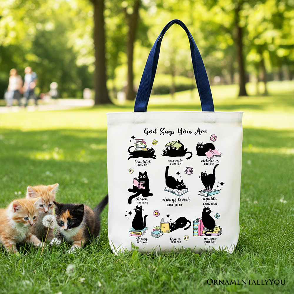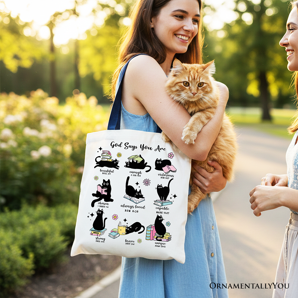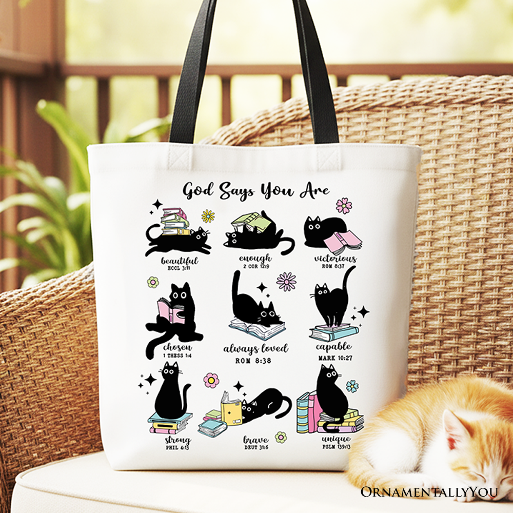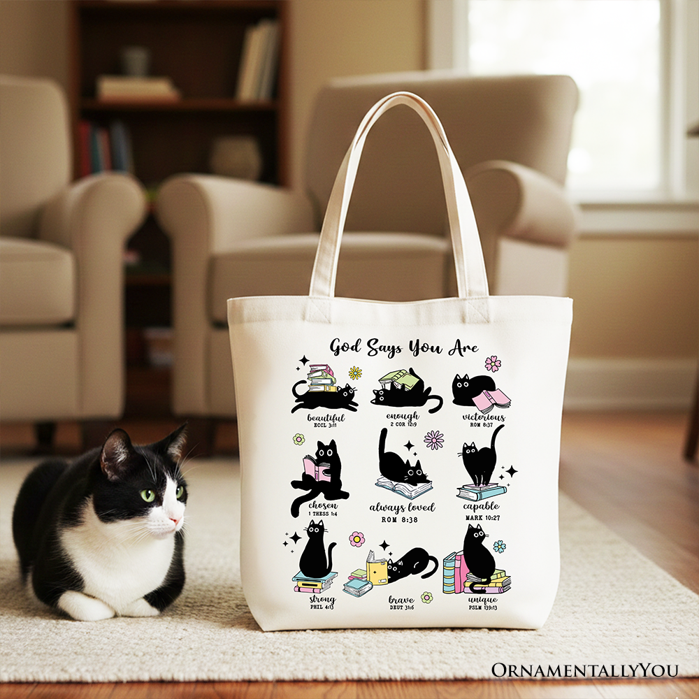 Book Cat God Says I Am Tote Bag, Christian Bible Verse Faith Gift Shopper