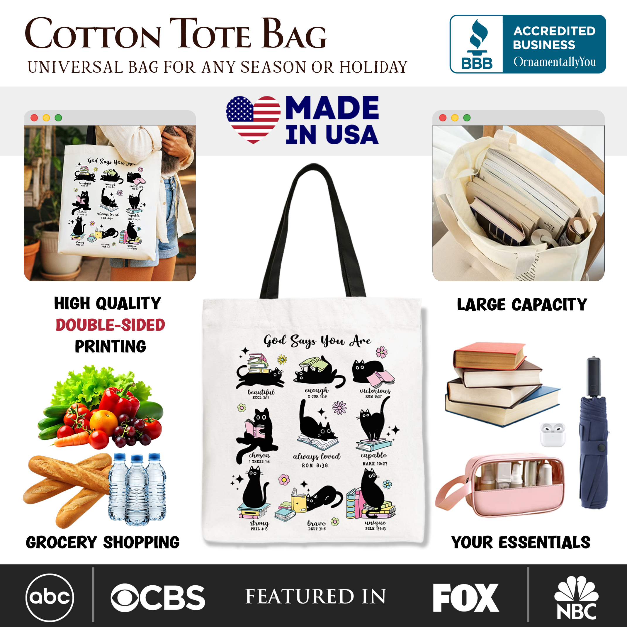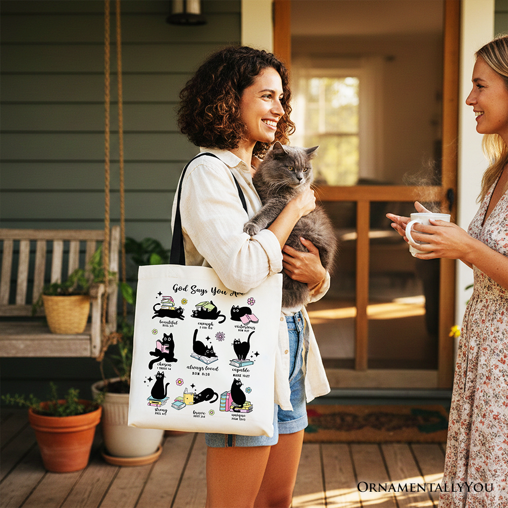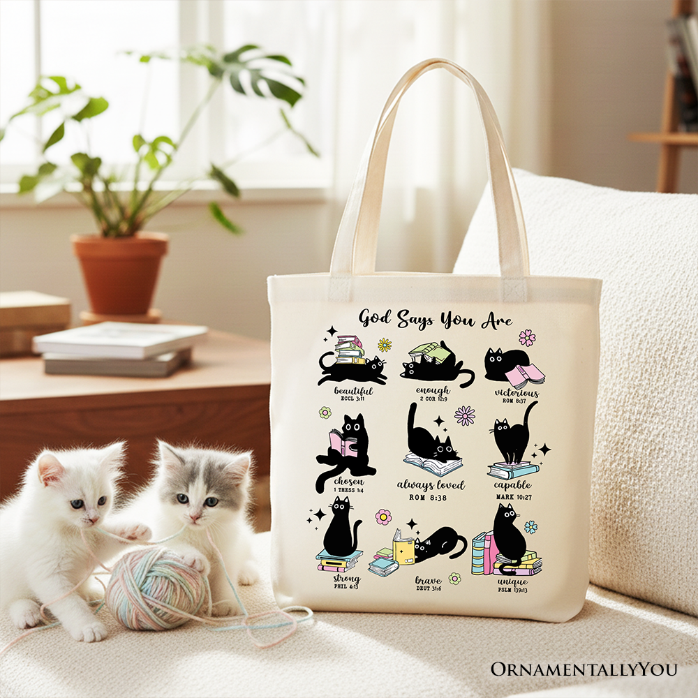 Book Cat God Says I Am Tote Bag, Christian Bible Verse Faith Gift Shopper
