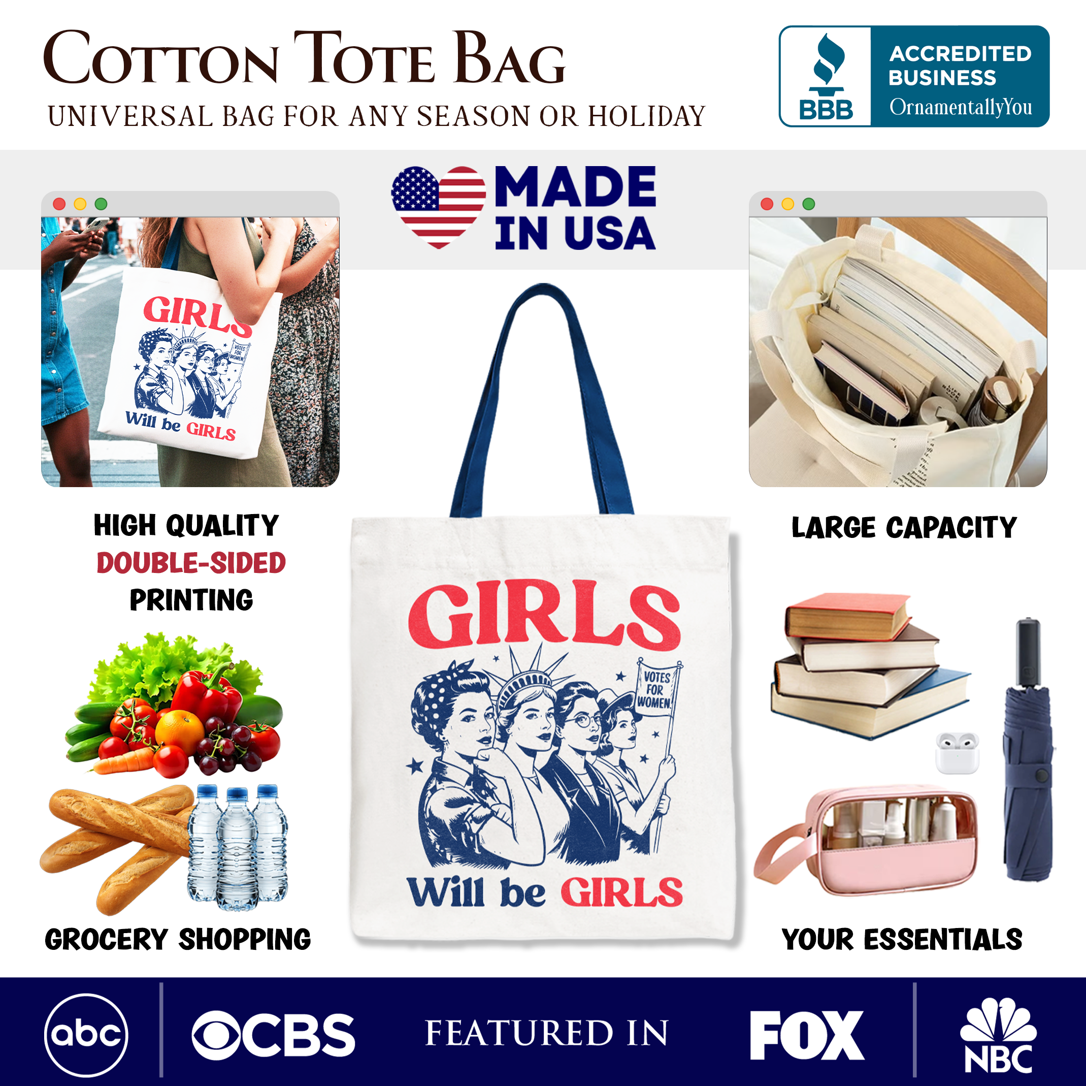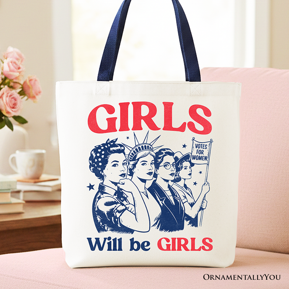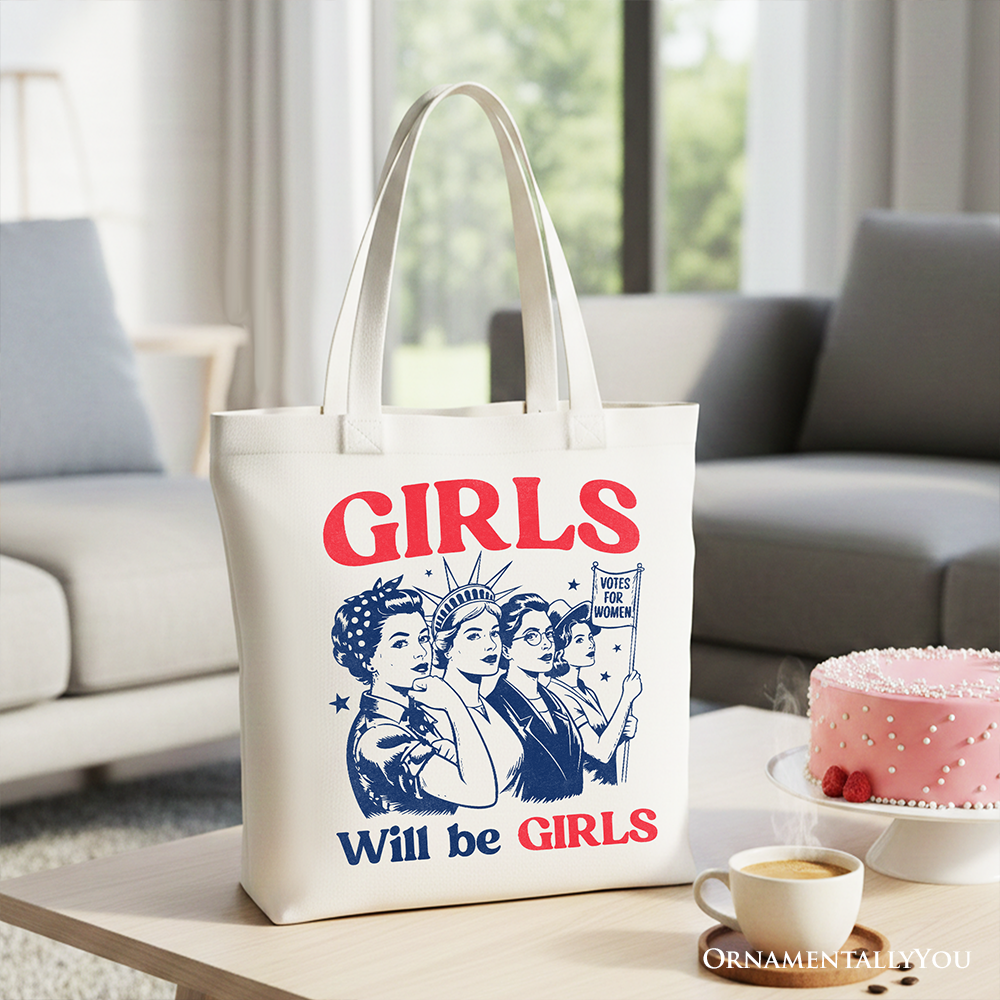 Girls Will Be Girls Patriotic Tote Bag, 4th of July Vintage Feminist Gift Shopper