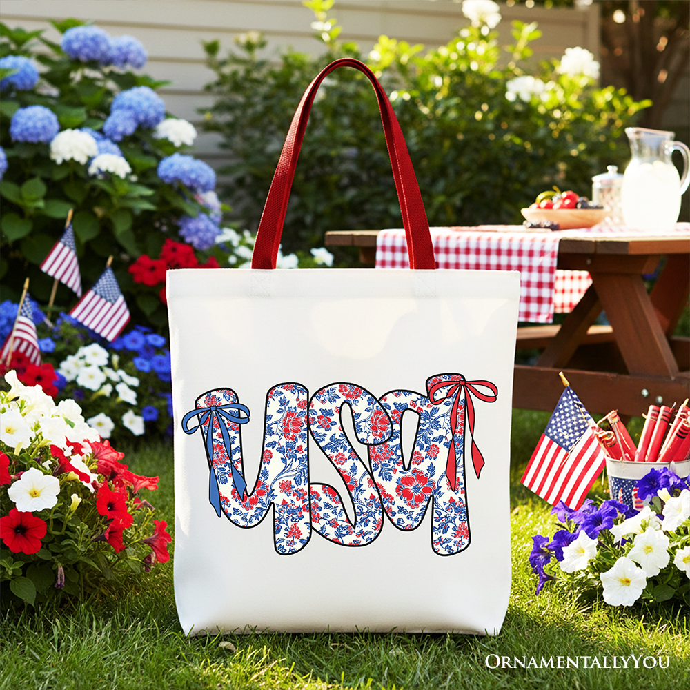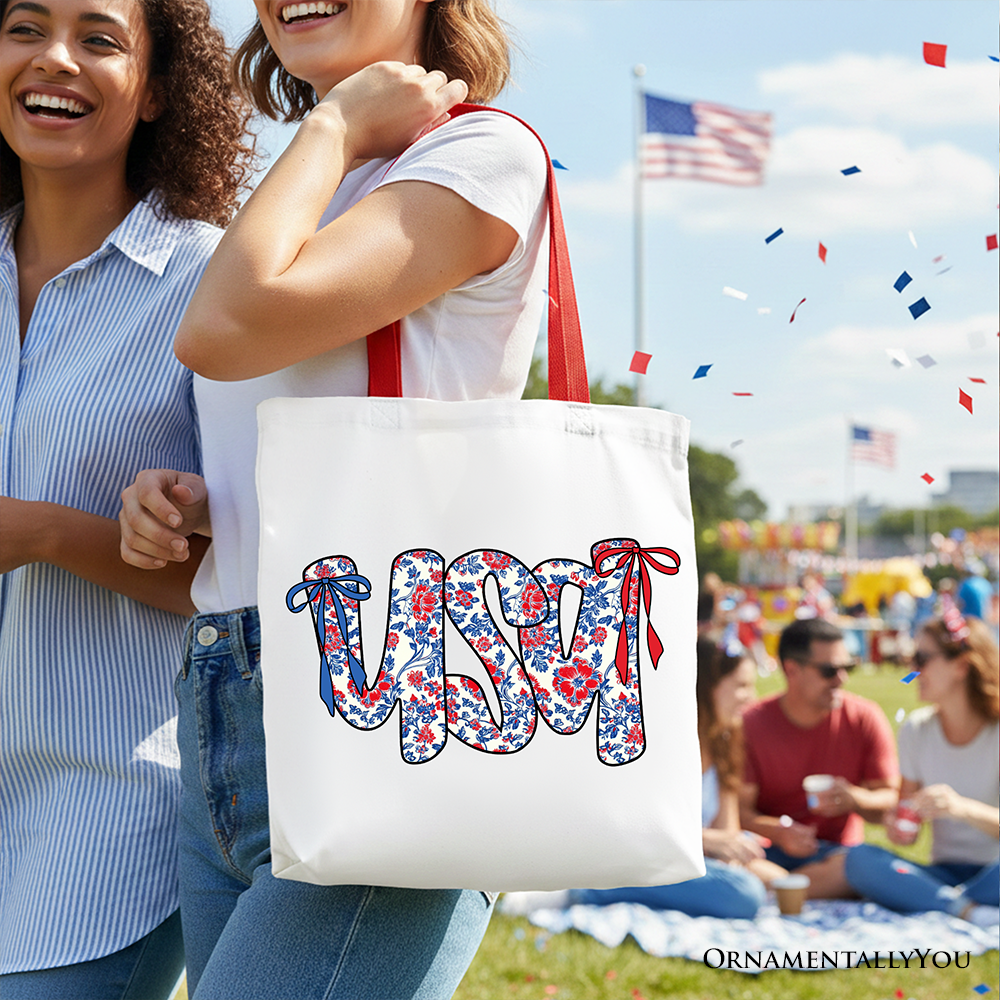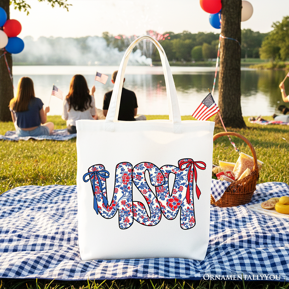Floral USA Patriotic Canvas Tote Bag, 4th of July Gift Shopper for Stylish Women