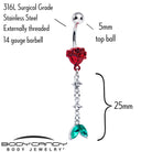 Add some romance to your look with this 14 gauge red rose navel ring. It's made with a 3/8 inch 316L surgical grade stainless steel curved barbell with a 5mm top ball end. The bottom end features a red rose charm that's brimming over with romantic style. Dangling beneath is a length of chain set with two clear gems and it features a pair of green gems at the end to represent the rose's leaves. You'll be blooming with classic romance when you're rocking this regal rose belly piercing jewelry.