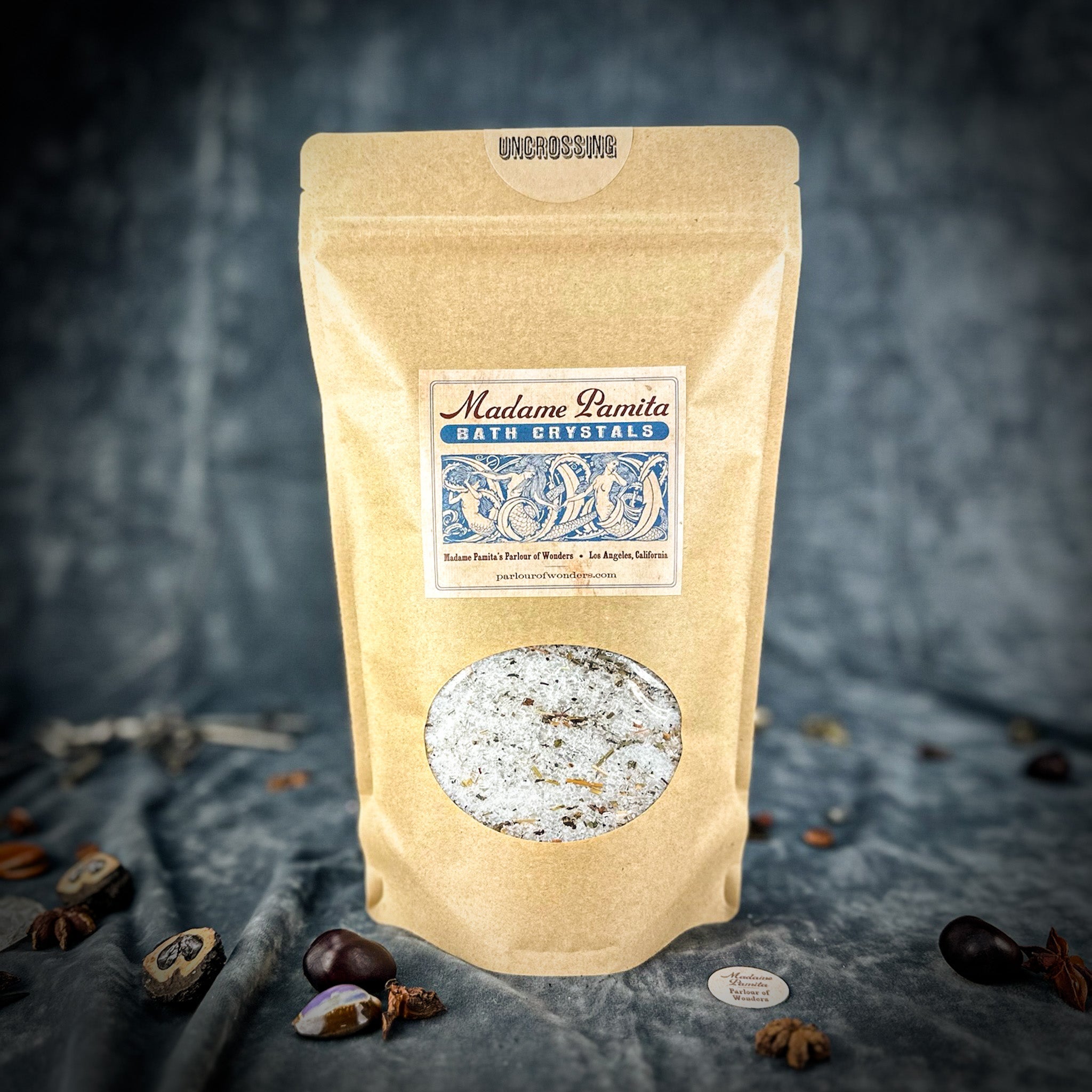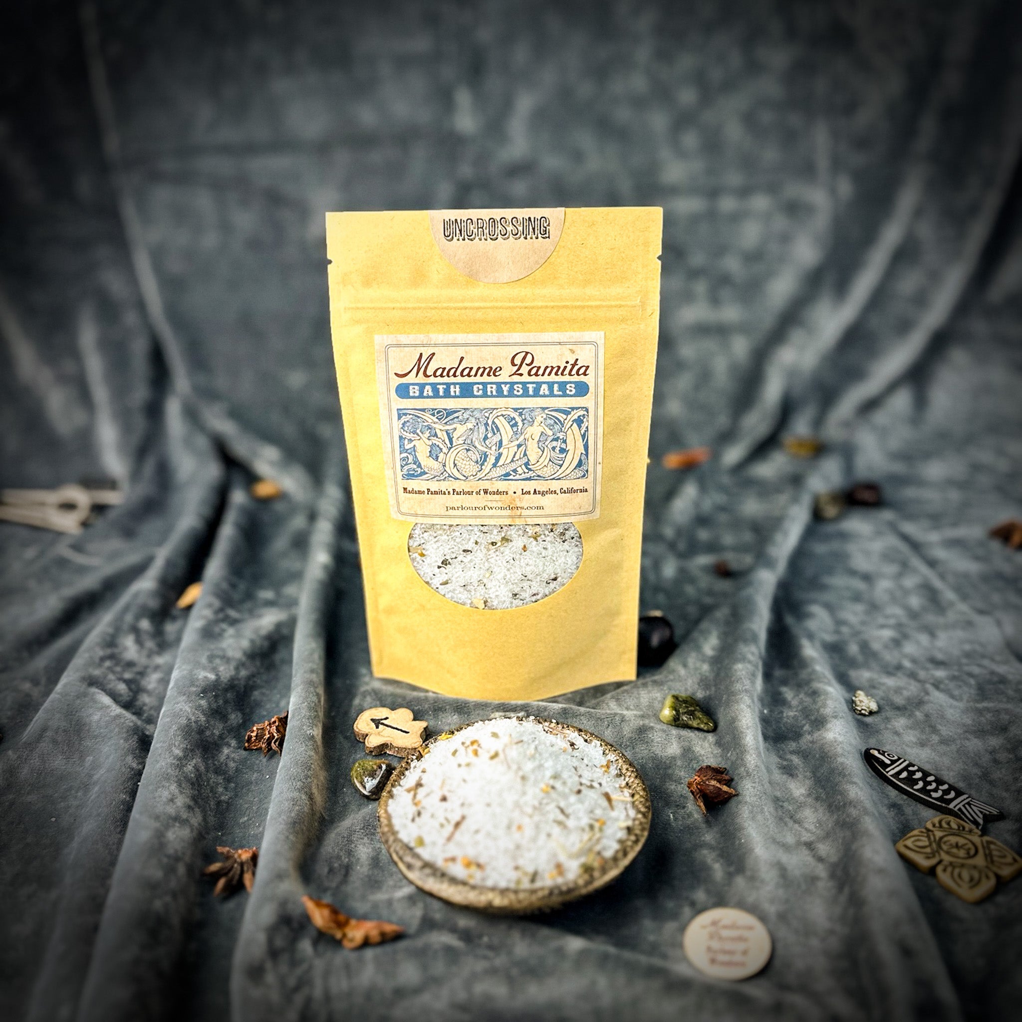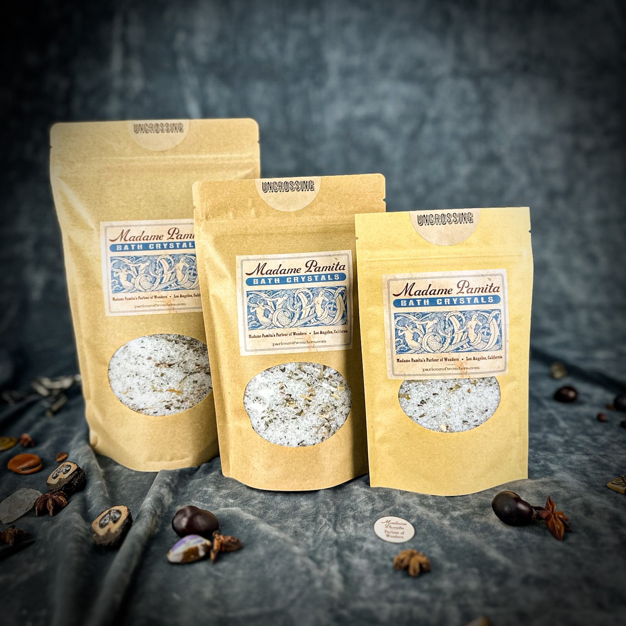 Crafted with the finest natural ingredients, Madame Pamita's Uncrossing Bath Crystals are inspired by traditional spiritual practices to remove the toughest negative magic and support your spiritual empowerment. Each blend includes all-natural sea salt, Epsom salts, organic or wildharvested herbs and botanicals, and organic essential oils thoughtfully combined to cleanse and protect your energy.