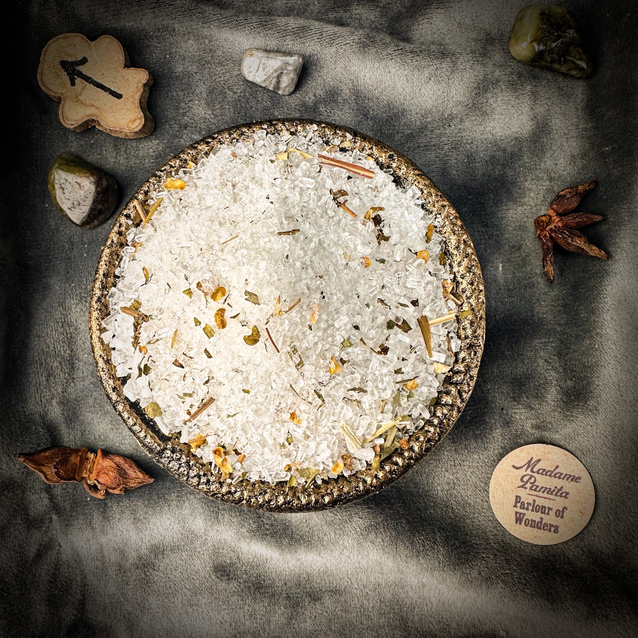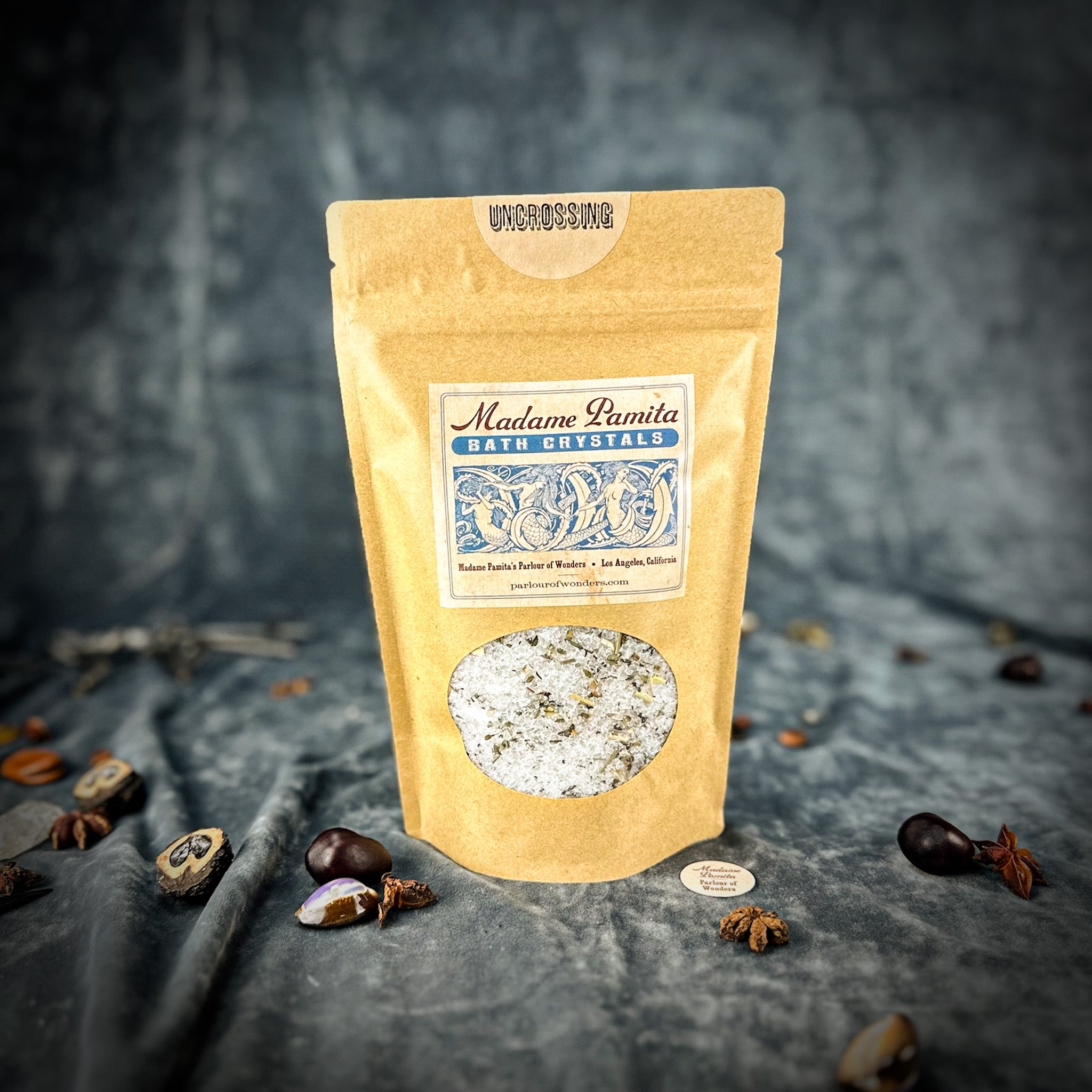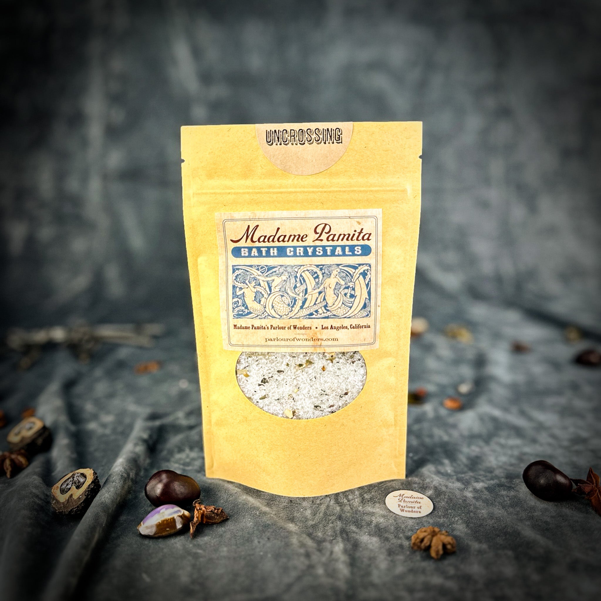 Crafted with the finest natural ingredients, Madame Pamita's Uncrossing Bath Crystals are inspired by traditional spiritual practices to remove the toughest negative magic and support your spiritual empowerment. Each blend includes all-natural sea salt, Epsom salts, organic or wildharvested herbs and botanicals, and organic essential oils thoughtfully combined to cleanse and protect your energy.