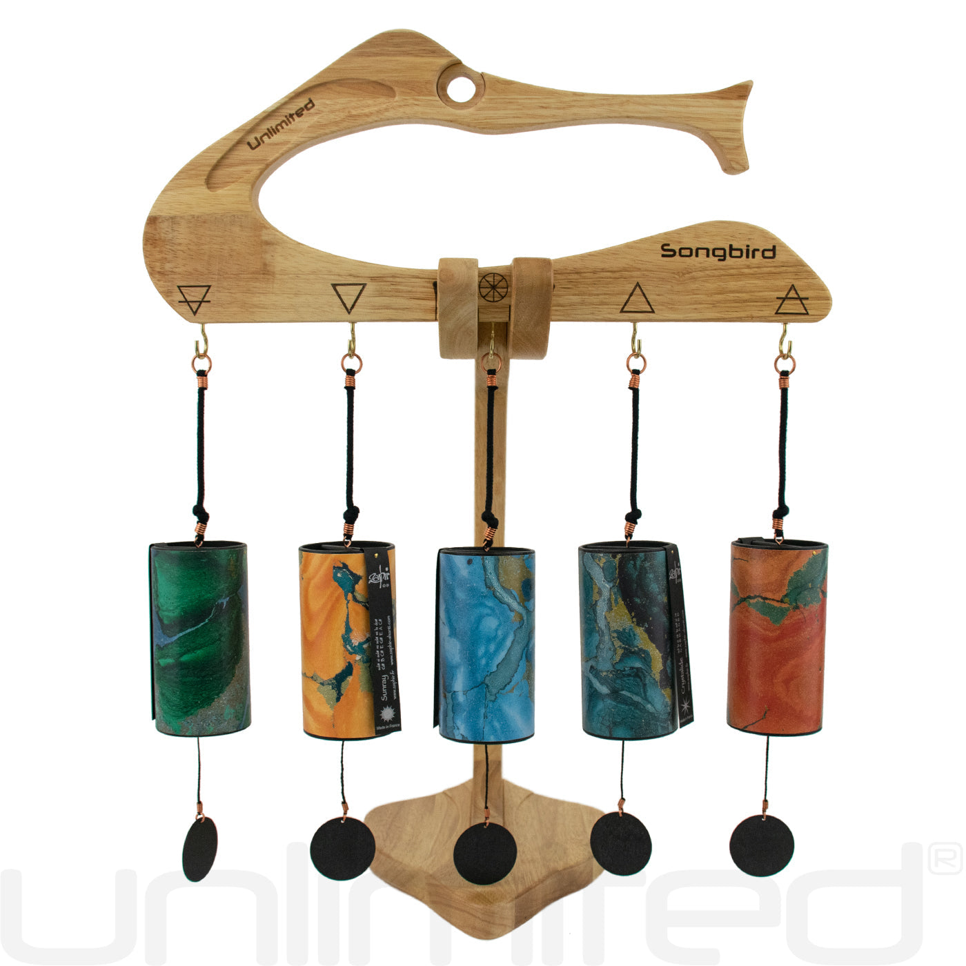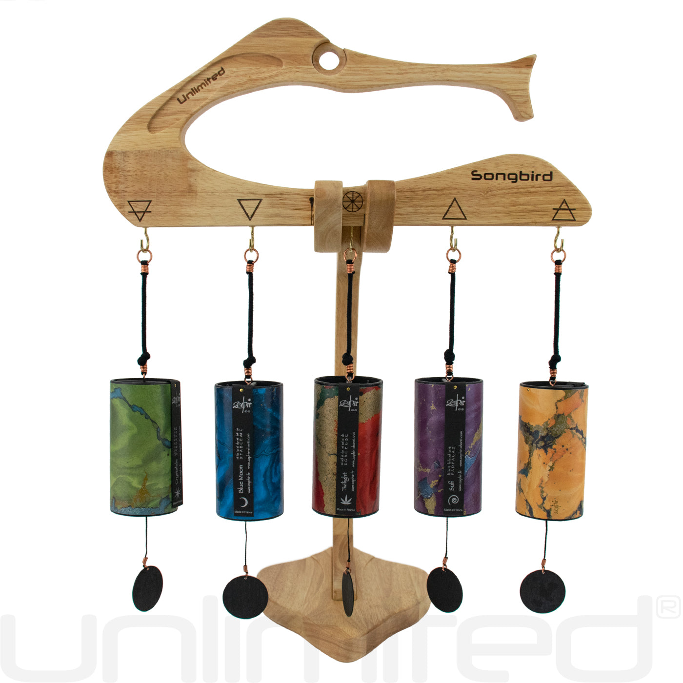 Zaphir Wind Chimes: Set #2 with High Five Chime Stand comes with one of each Zaphir tuning variant in complementary colors and our new chime stand.